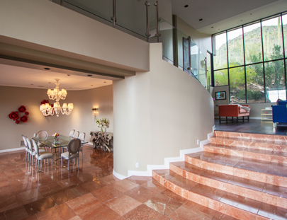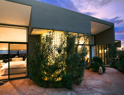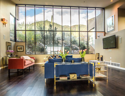 Glass walls reveal city and mountain